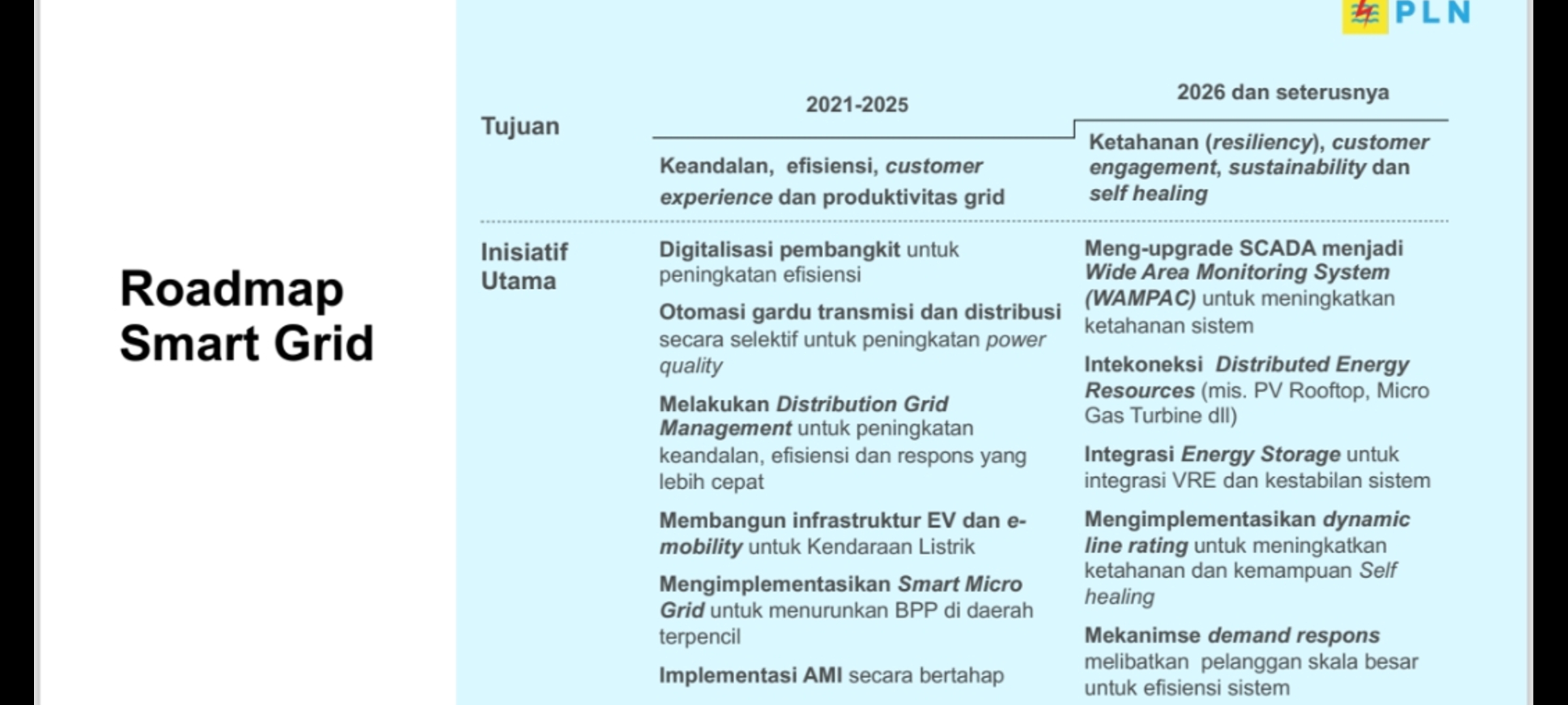 pemanfaatan smart grid telah masuk dalam matrik proyek pembangunan sub sektor ketenagalistrikan sesuai PERPRES 18 Tahun 2020 tentang Rencana Pembangunan Jangka Menengah Nasional (RPJMN) 2019-2024. Rencana pemanfaatan smart grid juga telah masuk dalam Rencana Umum Ketenagalistrikan Nasional (RUKN) tahun 2019-2028.