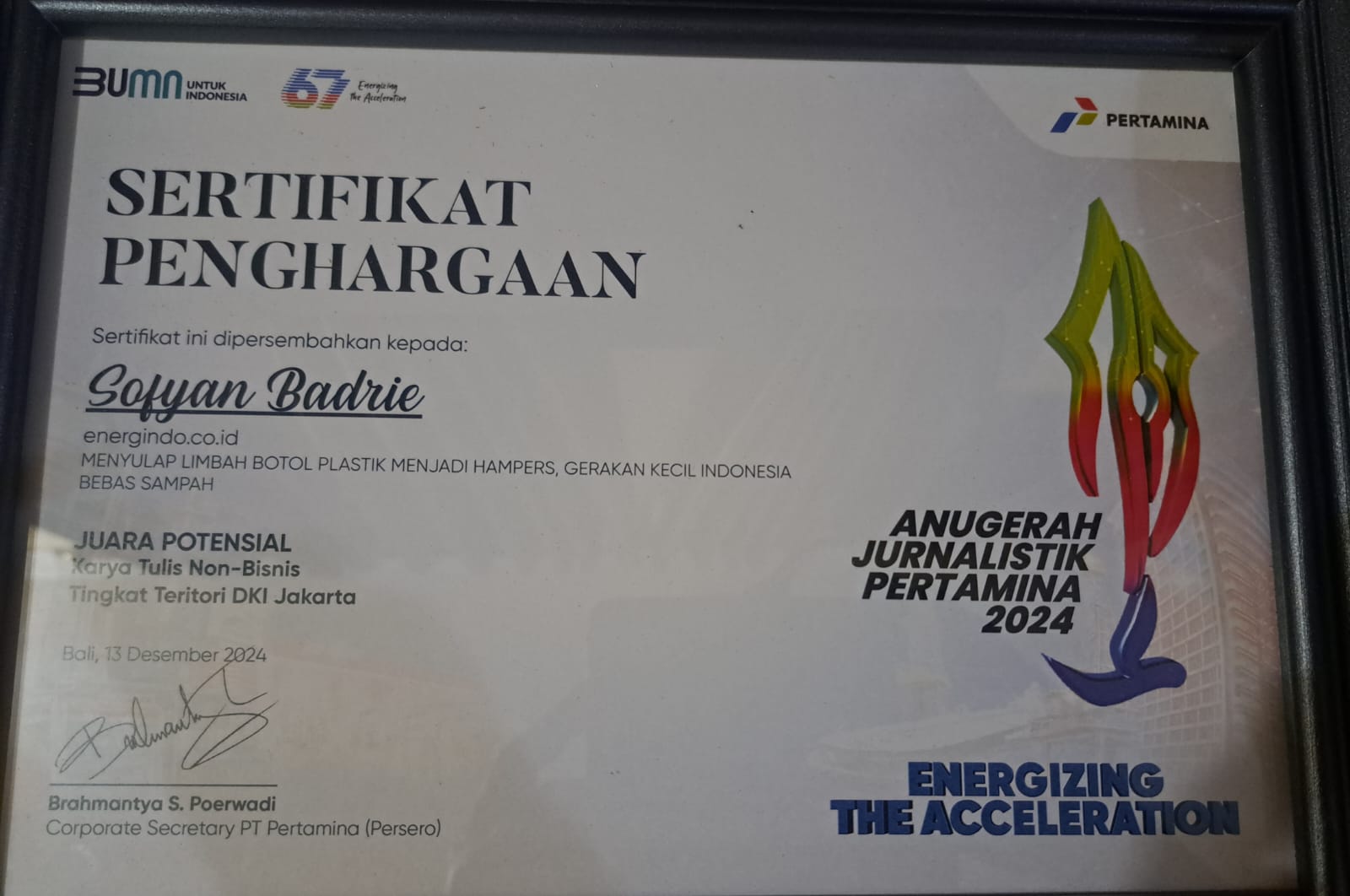 ditetapkan sebagai Juara Potensial untuk Kategori Bisnis – Karya Tulis di Tingkat Teritori Jawa Bagian Barat dalam ajang Kompetisi Anugerah Jurnalistik Pertamina (AJP) 2025. “Lumayan, sebagai jurnalis pemula,” kata Zuber, demikian ia kerap disapa, menanggapi prestasinya di AJP 2025.
